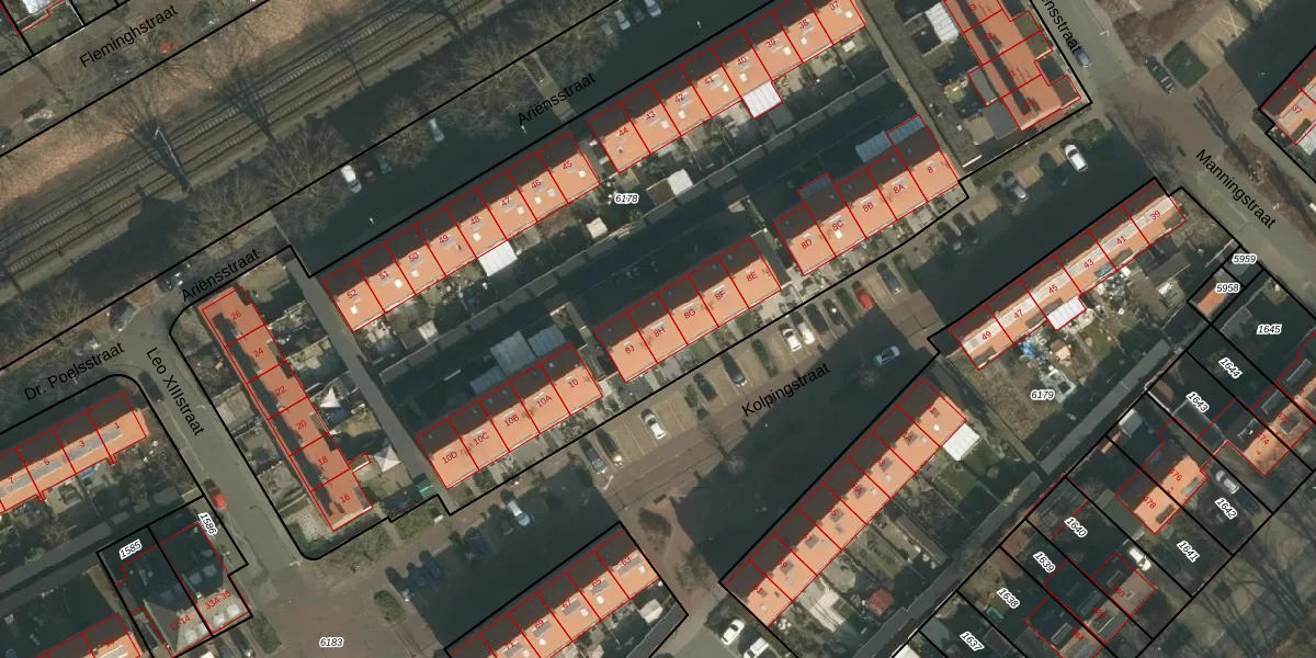 Het perceel waarop Kolpingstraat 8-H staat heeft een oppervlakte van 5855 m². Dit is een zeer groot perceel. De perceeloppervlakte wordt geregistreerd door het Kadaster. Gedetailleerde informatie over de maten van dit perceel kunt u vinden in het rapport Kadastrale kaart met maatvoering van Kolpingstraat 8-H.