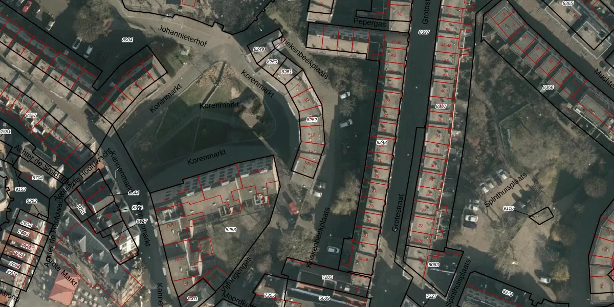 Korenmarkt 13 is gelegen op kadastraal perceel NMG00C8252. Deze kadastrale aanduiding is uniek en wordt gebruikt door het Kadaster om eigendomsrechten en andere zakelijke rechten vast te leggen. Het perceel maakt onderdeel uit van de kadastrale gemeente Nijmegen.