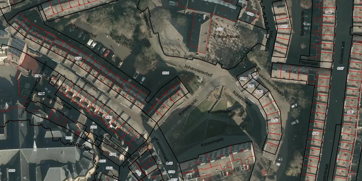 Het perceel waarop Korenmarkt 5 staat heeft een oppervlakte van 1294 m². Dit is een zeer groot perceel. De perceeloppervlakte wordt geregistreerd door het Kadaster. Gedetailleerde informatie over de maten van dit perceel kunt u vinden in het rapport Kadastrale kaart met maatvoering van Korenmarkt 5.