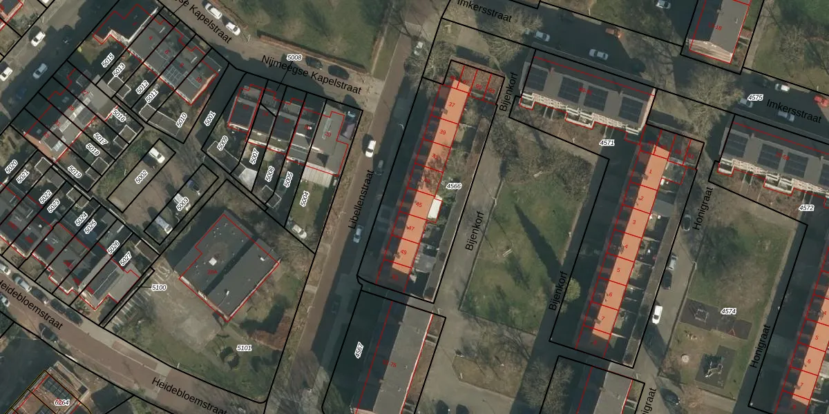 Libellenstraat 45 is gelegen op kadastraal perceel HTT02L4566. Deze kadastrale aanduiding is uniek en wordt gebruikt door het Kadaster om eigendomsrechten en andere zakelijke rechten vast te leggen. Het perceel maakt onderdeel uit van de kadastrale gemeente Hatert.