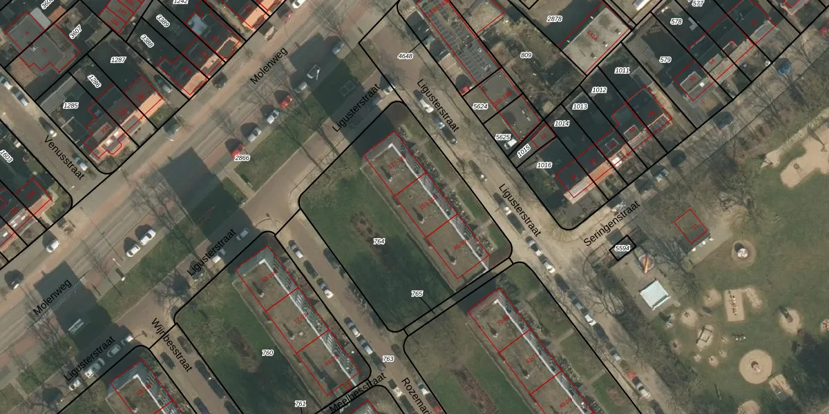 Het perceel waarop Ligusterstraat 115 staat heeft een oppervlakte van 1550 m². Dit is een zeer groot perceel. De perceeloppervlakte wordt geregistreerd door het Kadaster. Gedetailleerde informatie over de maten van dit perceel kunt u vinden in het rapport Kadastrale kaart met maatvoering van Ligusterstraat 115.