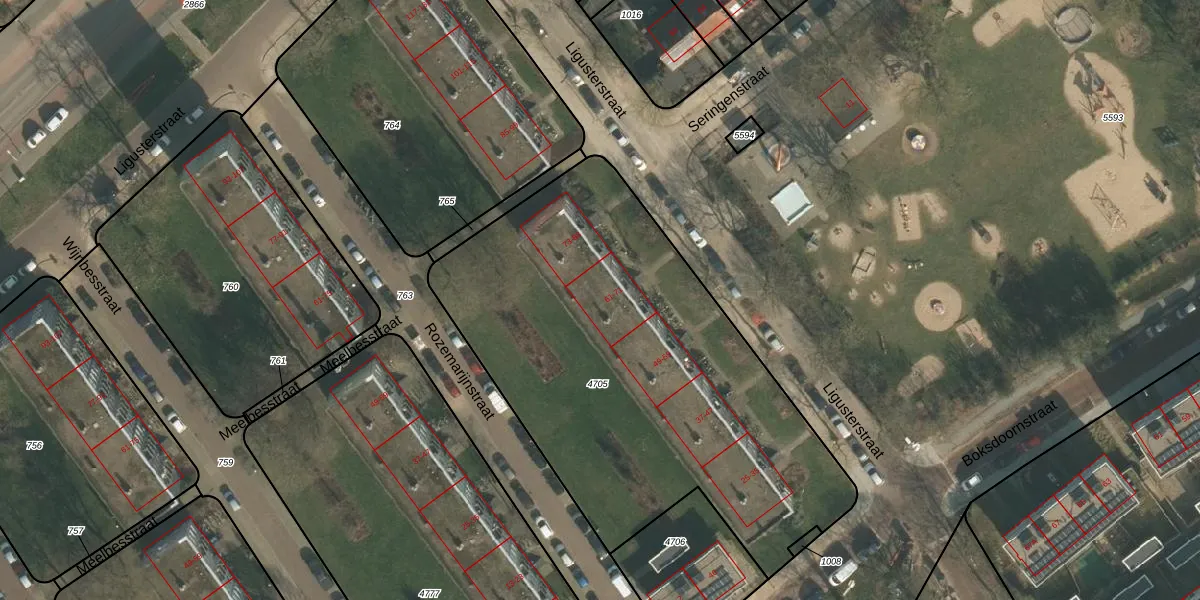 Het perceel waarop Ligusterstraat 63 staat heeft een oppervlakte van 2450 m². Dit is een zeer groot perceel. De perceeloppervlakte wordt geregistreerd door het Kadaster. Gedetailleerde informatie over de maten van dit perceel kunt u vinden in het rapport Kadastrale kaart met maatvoering van Ligusterstraat 63.