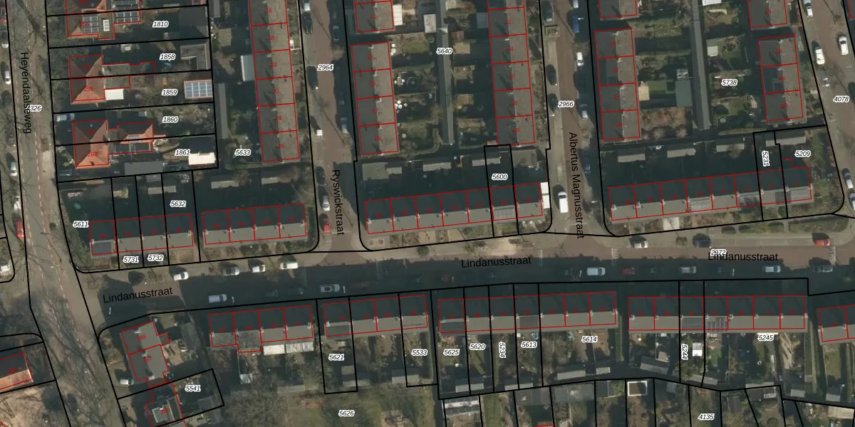 Het perceel waarop Lindanusstraat 26 staat heeft een oppervlakte van 4299 m². Dit is een zeer groot perceel. De perceeloppervlakte wordt geregistreerd door het Kadaster. Gedetailleerde informatie over de maten van dit perceel kunt u vinden in het rapport Kadastrale kaart met maatvoering van Lindanusstraat 26.