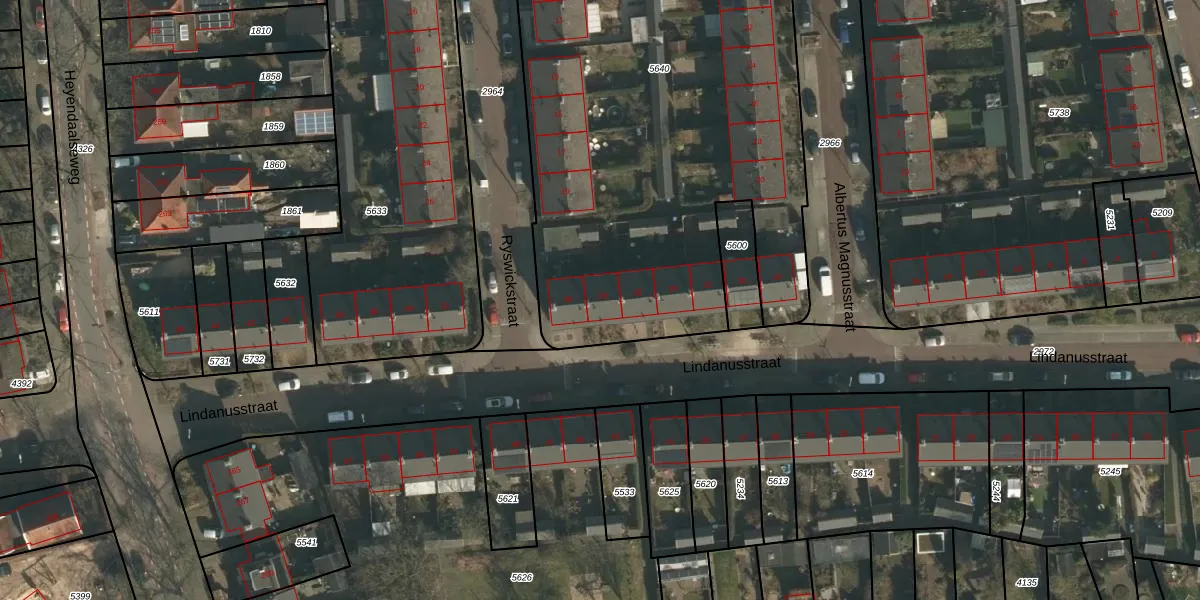 Het perceel waarop Lindanusstraat 28 staat heeft een oppervlakte van 4299 m². Dit is een zeer groot perceel. De perceeloppervlakte wordt geregistreerd door het Kadaster. Gedetailleerde informatie over de maten van dit perceel kunt u vinden in het rapport Kadastrale kaart met maatvoering van Lindanusstraat 28.
