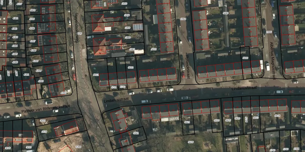 Het perceel waarop Lindanusstraat 36 staat heeft een oppervlakte van 2510 m². Dit is een zeer groot perceel. De perceeloppervlakte wordt geregistreerd door het Kadaster. Gedetailleerde informatie over de maten van dit perceel kunt u vinden in het rapport Kadastrale kaart met maatvoering van Lindanusstraat 36.