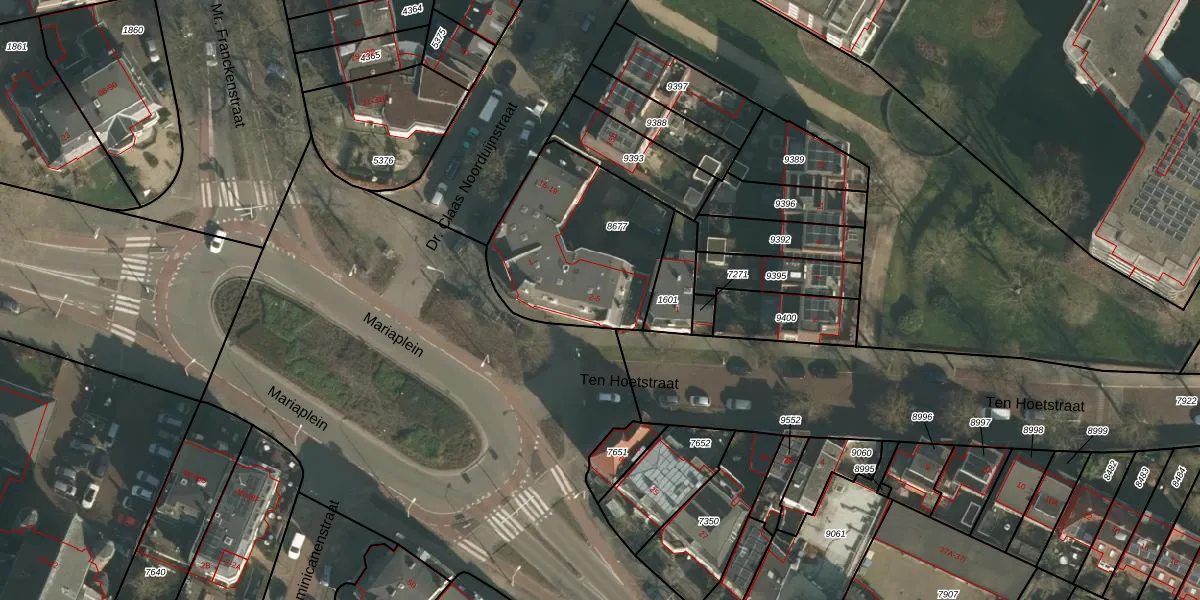 Het perceel waarop Mariaplein 3 staat heeft een oppervlakte van 690 m². Dit is een groot perceel. De perceeloppervlakte wordt geregistreerd door het Kadaster. Gedetailleerde informatie over de maten van dit perceel kunt u vinden in het rapport Kadastrale kaart met maatvoering van Mariaplein 3.