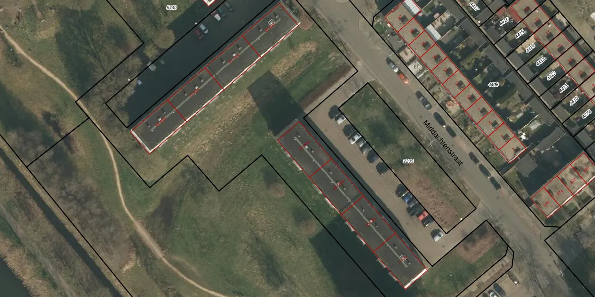 Het perceel waarop Middachtenstraat 45 staat heeft een oppervlakte van 9932 m². Dit is een zeer groot perceel. De perceeloppervlakte wordt geregistreerd door het Kadaster. Gedetailleerde informatie over de maten van dit perceel kunt u vinden in het rapport Kadastrale kaart met maatvoering van Middachtenstraat 45.