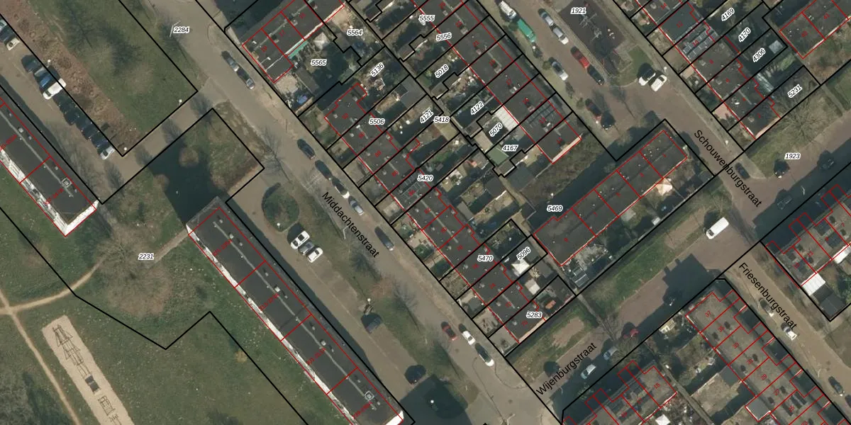 Het perceel waarop Middachtenstraat 82 staat heeft een oppervlakte van 1745 m². Dit is een zeer groot perceel. De perceeloppervlakte wordt geregistreerd door het Kadaster. Gedetailleerde informatie over de maten van dit perceel kunt u vinden in het rapport Kadastrale kaart met maatvoering van Middachtenstraat 82.