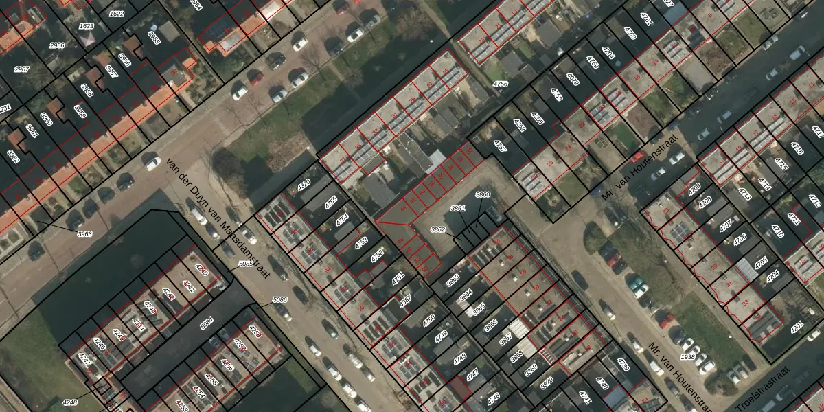 Mr. van Houtenstraat 42 is gelegen op kadastraal perceel HTT02D4756. Deze kadastrale aanduiding is uniek en wordt gebruikt door het Kadaster om eigendomsrechten en andere zakelijke rechten vast te leggen. Het perceel maakt onderdeel uit van de kadastrale gemeente Hatert.