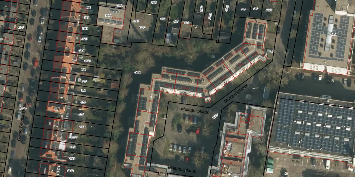 Het perceel waarop Multatuliplaats 41 staat heeft een oppervlakte van 4835 m². Dit is een zeer groot perceel. De perceeloppervlakte wordt geregistreerd door het Kadaster. Gedetailleerde informatie over de maten van dit perceel kunt u vinden in het rapport Kadastrale kaart met maatvoering van Multatuliplaats 41.