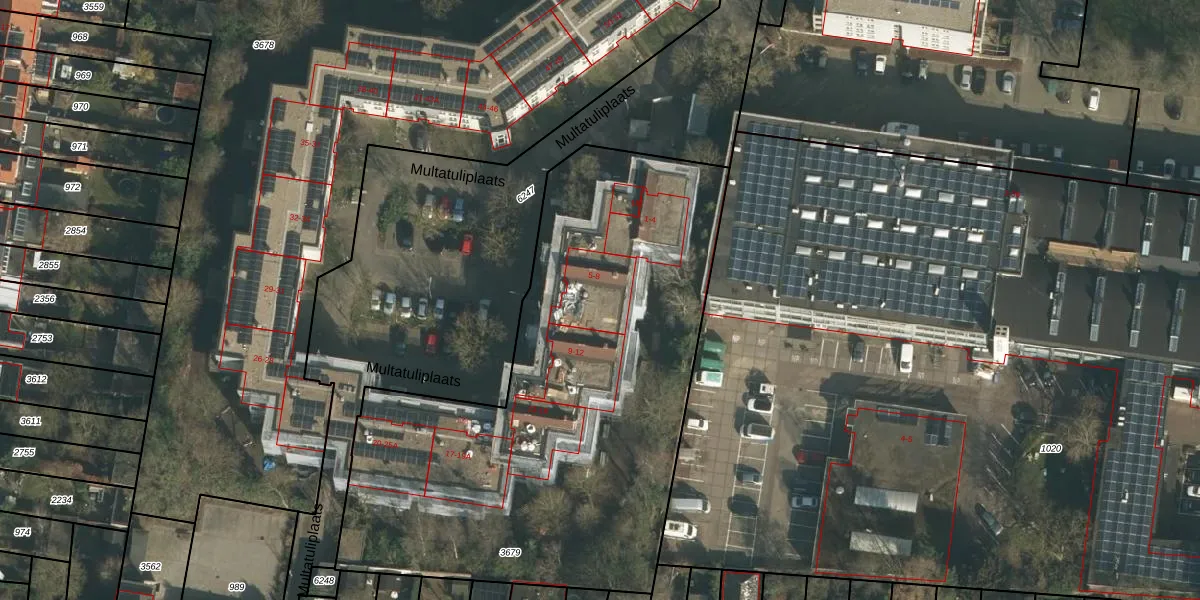 Het perceel waarop Multatuliplaats 6 staat heeft een oppervlakte van 2860 m². Dit is een zeer groot perceel. De perceeloppervlakte wordt geregistreerd door het Kadaster. Gedetailleerde informatie over de maten van dit perceel kunt u vinden in het rapport Kadastrale kaart met maatvoering van Multatuliplaats 6.