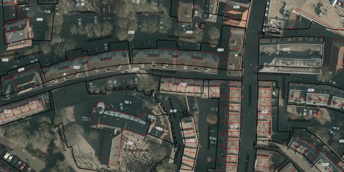 Nonnenstraat 34 is gelegen op kadastraal perceel NMG00C8245. Deze kadastrale aanduiding is uniek en wordt gebruikt door het Kadaster om eigendomsrechten en andere zakelijke rechten vast te leggen. Het perceel maakt onderdeel uit van de kadastrale gemeente Nijmegen.