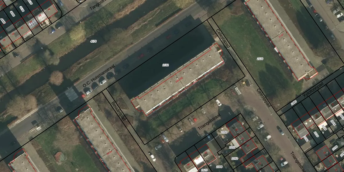 Het perceel waarop O.C. Huismanstraat 201 staat heeft een oppervlakte van 2810 m². Dit is een zeer groot perceel. De perceeloppervlakte wordt geregistreerd door het Kadaster. Gedetailleerde informatie over de maten van dit perceel kunt u vinden in het rapport Kadastrale kaart met maatvoering van O.C. Huismanstraat 201.