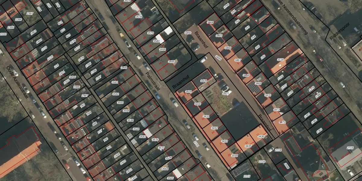Het perceel waarop Palmstraat 30 staat heeft een oppervlakte van 95 m². Dit is een klein perceel. De perceeloppervlakte wordt geregistreerd door het Kadaster. Gedetailleerde informatie over de maten van dit perceel kunt u vinden in het rapport Kadastrale kaart met maatvoering van Palmstraat 30.