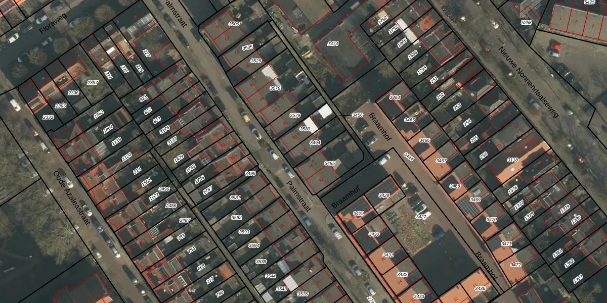 Palmstraat 36 is gelegen op kadastraal perceel NBH00I3494. Deze kadastrale aanduiding is uniek en wordt gebruikt door het Kadaster om eigendomsrechten en andere zakelijke rechten vast te leggen. Het perceel maakt onderdeel uit van de kadastrale gemeente Neerbosch.