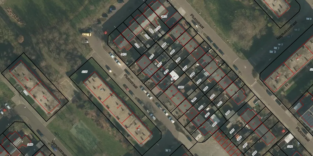 Het perceel waarop Plutostraat 45 staat heeft een oppervlakte van 155 m². Dit is een middelgroot perceel. De perceeloppervlakte wordt geregistreerd door het Kadaster. Gedetailleerde informatie over de maten van dit perceel kunt u vinden in het rapport Kadastrale kaart met maatvoering van Plutostraat 45.