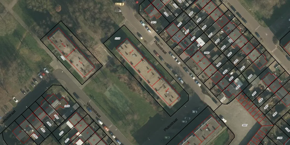 Het perceel waarop Plutostraat 52 staat heeft een oppervlakte van 1309 m². Dit is een zeer groot perceel. De perceeloppervlakte wordt geregistreerd door het Kadaster. Gedetailleerde informatie over de maten van dit perceel kunt u vinden in het rapport Kadastrale kaart met maatvoering van Plutostraat 52.