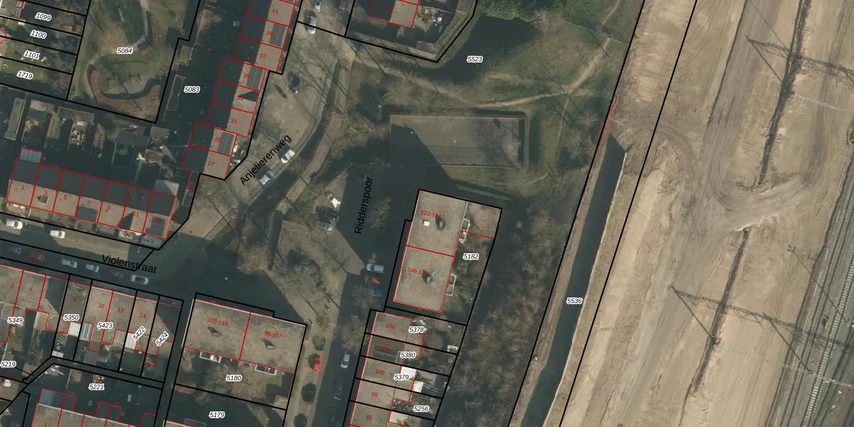 Het perceel waarop Ridderspoor 126 staat heeft een oppervlakte van 580 m². Dit is een groot perceel. De perceeloppervlakte wordt geregistreerd door het Kadaster. Gedetailleerde informatie over de maten van dit perceel kunt u vinden in het rapport Kadastrale kaart met maatvoering van Ridderspoor 126.