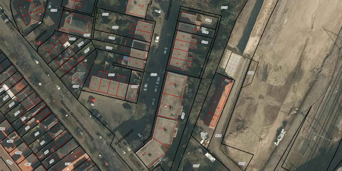 Ridderspoor 34 is gelegen op kadastraal perceel NBH00B5186. Deze kadastrale aanduiding is uniek en wordt gebruikt door het Kadaster om eigendomsrechten en andere zakelijke rechten vast te leggen. Het perceel maakt onderdeel uit van de kadastrale gemeente Neerbosch.