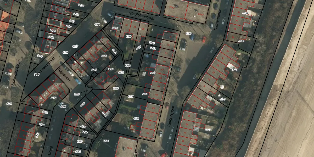 Het perceel waarop Ridderspoor 65 staat heeft een oppervlakte van 455 m². Dit is een groot perceel. De perceeloppervlakte wordt geregistreerd door het Kadaster. Gedetailleerde informatie over de maten van dit perceel kunt u vinden in het rapport Kadastrale kaart met maatvoering van Ridderspoor 65.