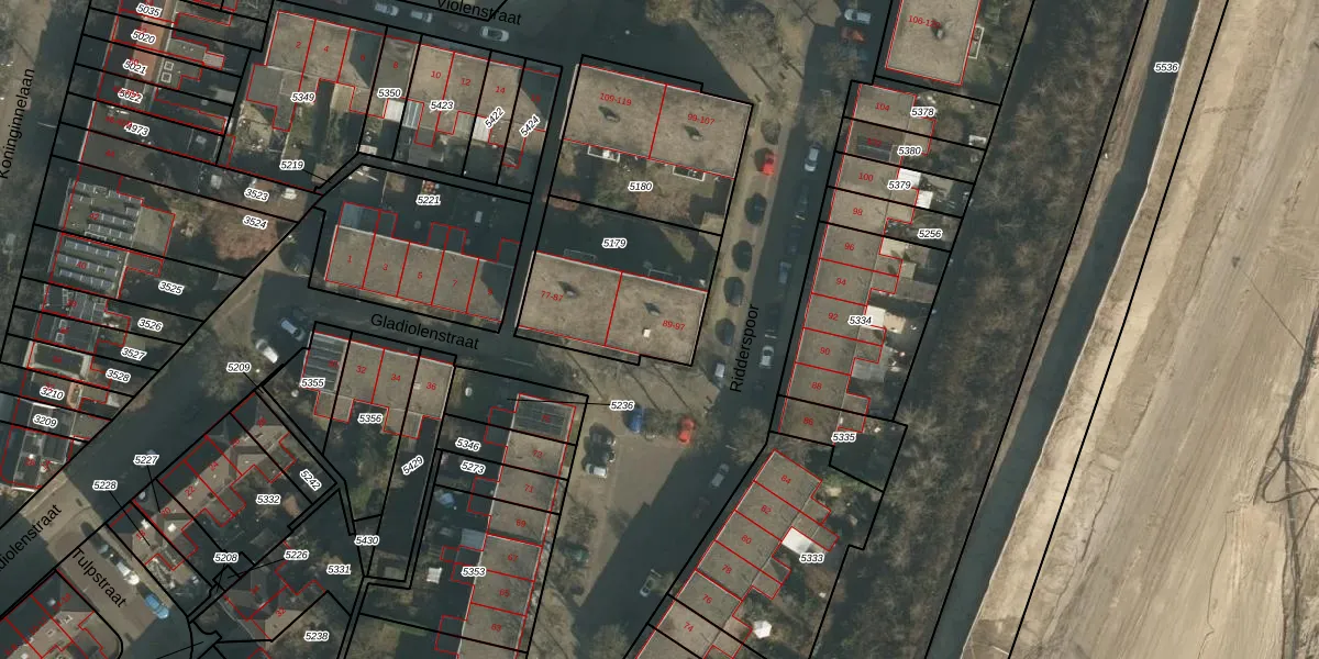 Het perceel waarop Ridderspoor 97 staat heeft een oppervlakte van 575 m². Dit is een groot perceel. De perceeloppervlakte wordt geregistreerd door het Kadaster. Gedetailleerde informatie over de maten van dit perceel kunt u vinden in het rapport Kadastrale kaart met maatvoering van Ridderspoor 97.