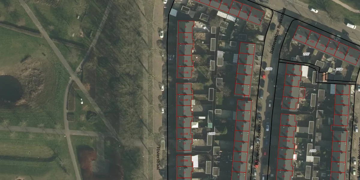 Rivierstraat 13 is gelegen op kadastraal perceel NBH00A2155. Deze kadastrale aanduiding is uniek en wordt gebruikt door het Kadaster om eigendomsrechten en andere zakelijke rechten vast te leggen. Het perceel maakt onderdeel uit van de kadastrale gemeente Neerbosch.
