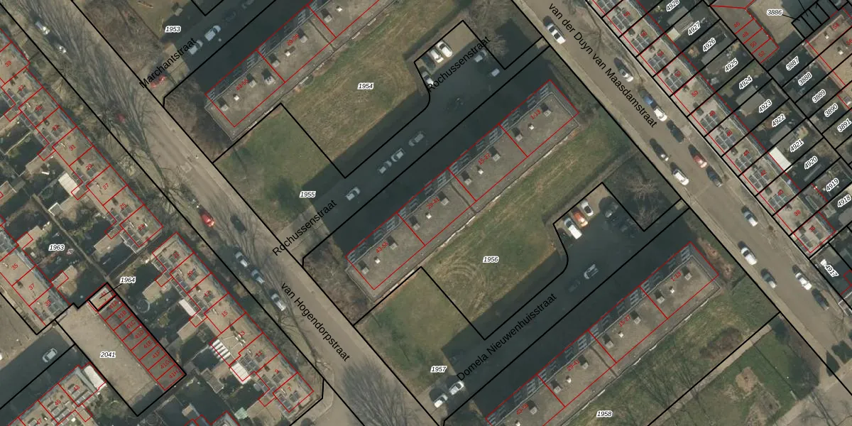 Het perceel waarop Rochussenstraat 41 staat heeft een oppervlakte van 2700 m². Dit is een zeer groot perceel. De perceeloppervlakte wordt geregistreerd door het Kadaster. Gedetailleerde informatie over de maten van dit perceel kunt u vinden in het rapport Kadastrale kaart met maatvoering van Rochussenstraat 41.