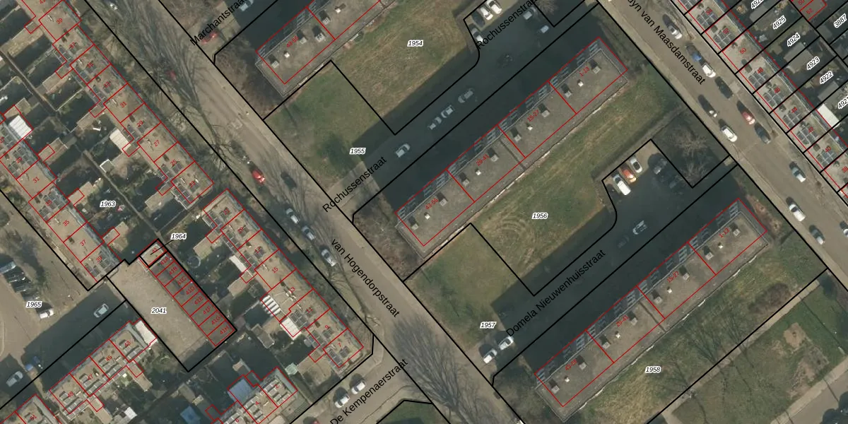 Het perceel waarop Rochussenstraat 49 staat heeft een oppervlakte van 2700 m². Dit is een zeer groot perceel. De perceeloppervlakte wordt geregistreerd door het Kadaster. Gedetailleerde informatie over de maten van dit perceel kunt u vinden in het rapport Kadastrale kaart met maatvoering van Rochussenstraat 49.