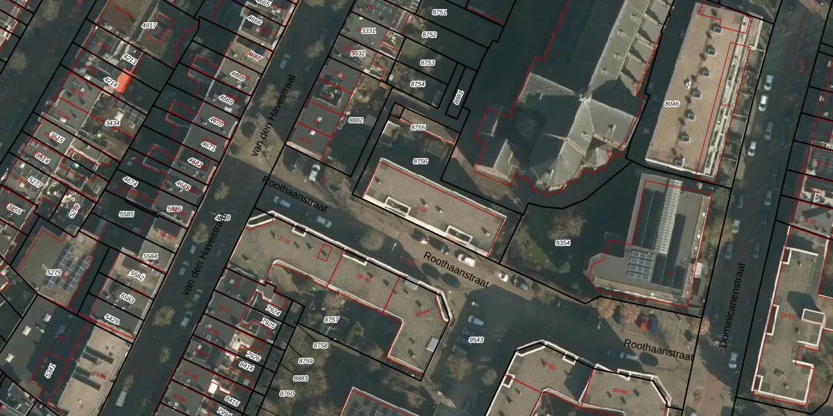 Roothaanstraat 21 is gelegen op kadastraal perceel HTT02A8756. Deze kadastrale aanduiding is uniek en wordt gebruikt door het Kadaster om eigendomsrechten en andere zakelijke rechten vast te leggen. Het perceel maakt onderdeel uit van de kadastrale gemeente Hatert.