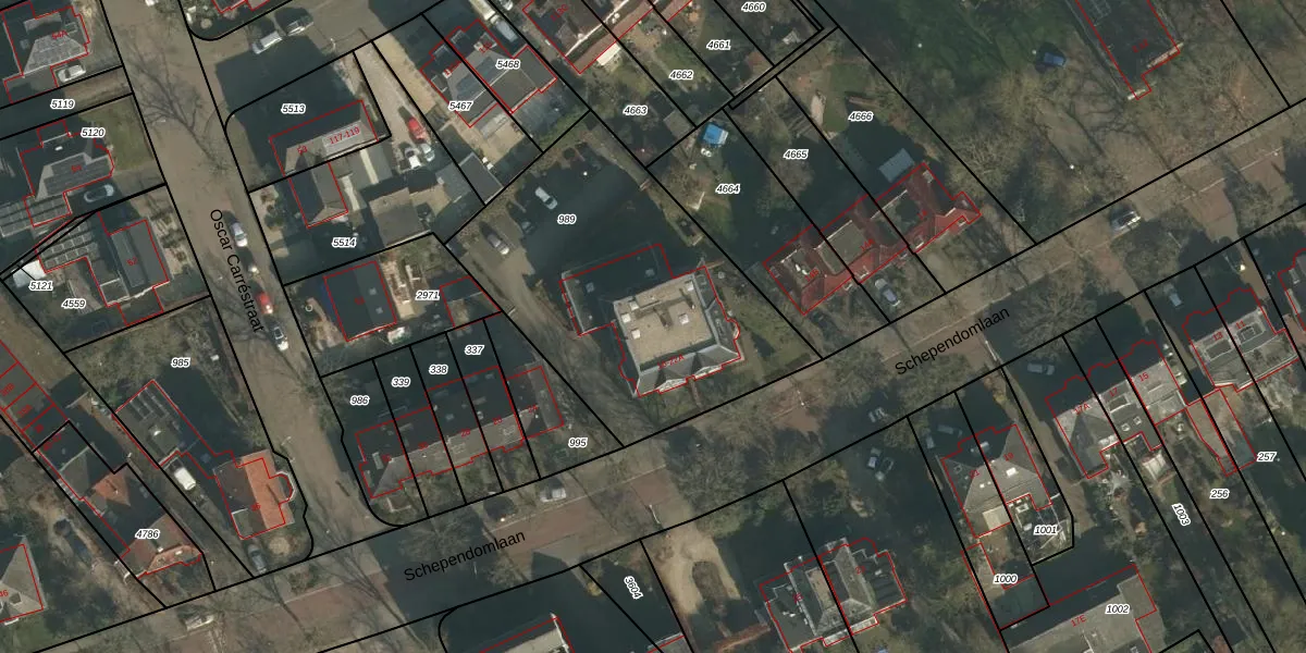 Het perceel waarop Schependomlaan 20-A staat heeft een oppervlakte van 1465 m². Dit is een zeer groot perceel. De perceeloppervlakte wordt geregistreerd door het Kadaster. Gedetailleerde informatie over de maten van dit perceel kunt u vinden in het rapport Kadastrale kaart met maatvoering van Schependomlaan 20-A.