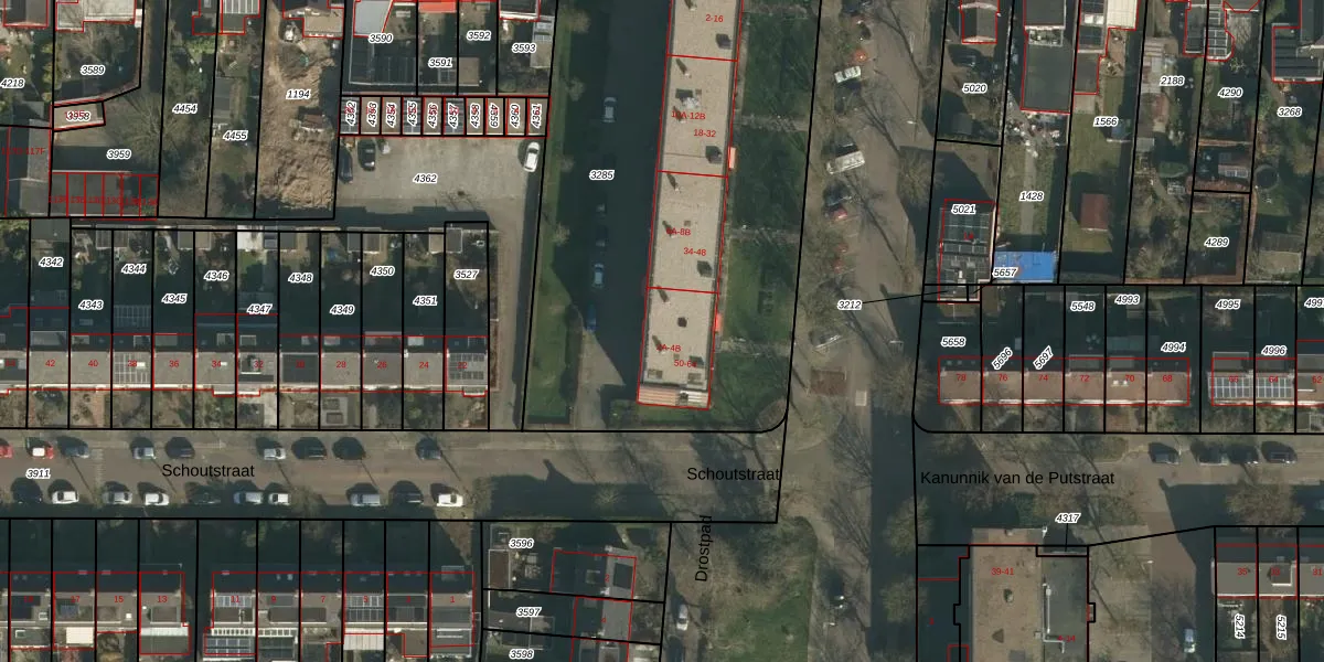 Het perceel waarop Schoutstraat 4-A staat heeft een oppervlakte van 3235 m². Dit is een zeer groot perceel. De perceeloppervlakte wordt geregistreerd door het Kadaster. Gedetailleerde informatie over de maten van dit perceel kunt u vinden in het rapport Kadastrale kaart met maatvoering van Schoutstraat 4-A.