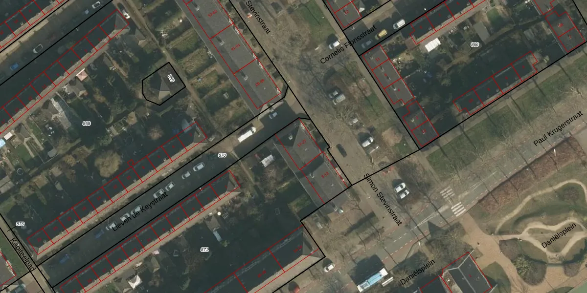 Het perceel waarop Simon Stevinstraat 23 staat heeft een oppervlakte van 4300 m². Dit is een zeer groot perceel. De perceeloppervlakte wordt geregistreerd door het Kadaster. Gedetailleerde informatie over de maten van dit perceel kunt u vinden in het rapport Kadastrale kaart met maatvoering van Simon Stevinstraat 23.