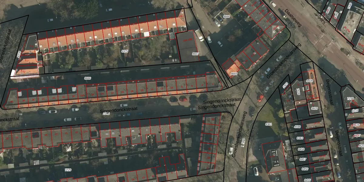 Het perceel waarop Singendonckstraat 8 staat heeft een oppervlakte van 2046 m². Dit is een zeer groot perceel. De perceeloppervlakte wordt geregistreerd door het Kadaster. Gedetailleerde informatie over de maten van dit perceel kunt u vinden in het rapport Kadastrale kaart met maatvoering van Singendonckstraat 8.