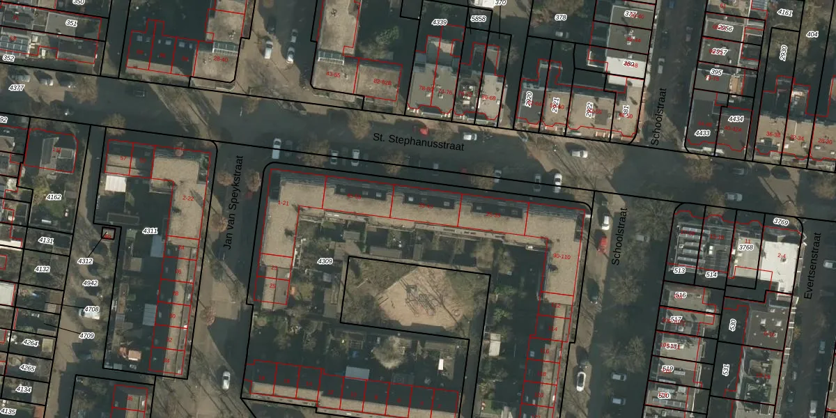Het perceel waarop St. Stephanusstraat 41 staat heeft een oppervlakte van 3830 m². Dit is een zeer groot perceel. De perceeloppervlakte wordt geregistreerd door het Kadaster. Gedetailleerde informatie over de maten van dit perceel kunt u vinden in het rapport Kadastrale kaart met maatvoering van St. Stephanusstraat 41.