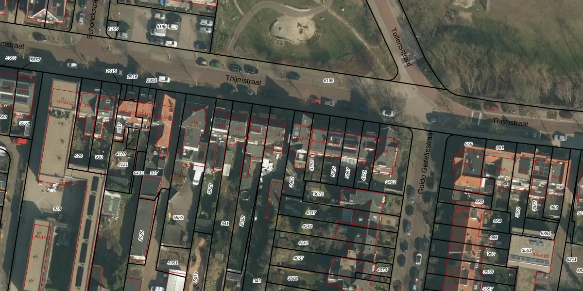 Het perceel waarop Thijmstraat 107 staat heeft een oppervlakte van 202 m². Dit is een middelgroot perceel. De perceeloppervlakte wordt geregistreerd door het Kadaster. Gedetailleerde informatie over de maten van dit perceel kunt u vinden in het rapport Kadastrale kaart met maatvoering van Thijmstraat 107.