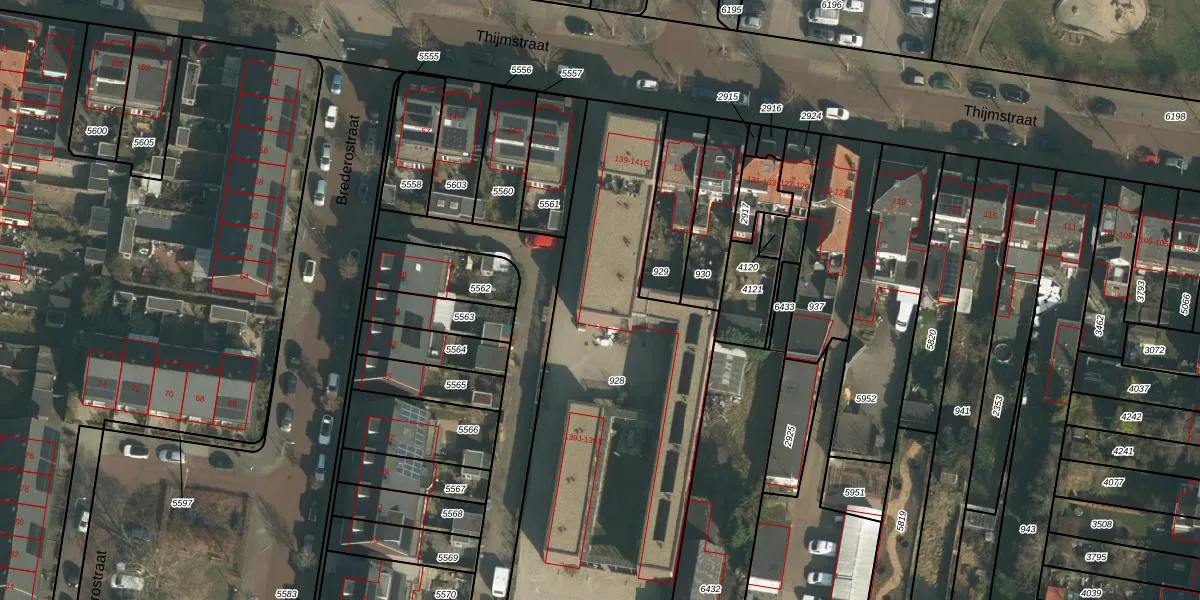 Het perceel waarop Thijmstraat 139-P staat heeft een oppervlakte van 2168 m². Dit is een zeer groot perceel. De perceeloppervlakte wordt geregistreerd door het Kadaster. Gedetailleerde informatie over de maten van dit perceel kunt u vinden in het rapport Kadastrale kaart met maatvoering van Thijmstraat 139-P.