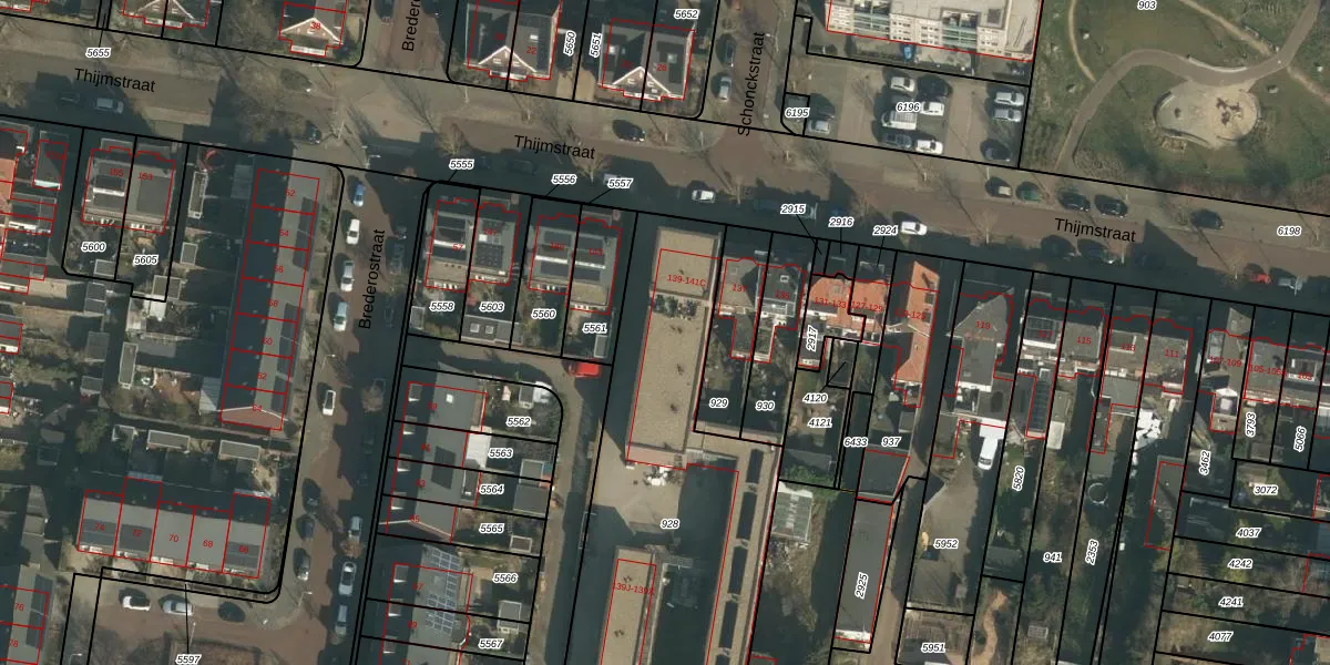Het perceel waarop Thijmstraat 141-A staat heeft een oppervlakte van 2168 m². Dit is een zeer groot perceel. De perceeloppervlakte wordt geregistreerd door het Kadaster. Gedetailleerde informatie over de maten van dit perceel kunt u vinden in het rapport Kadastrale kaart met maatvoering van Thijmstraat 141-A.