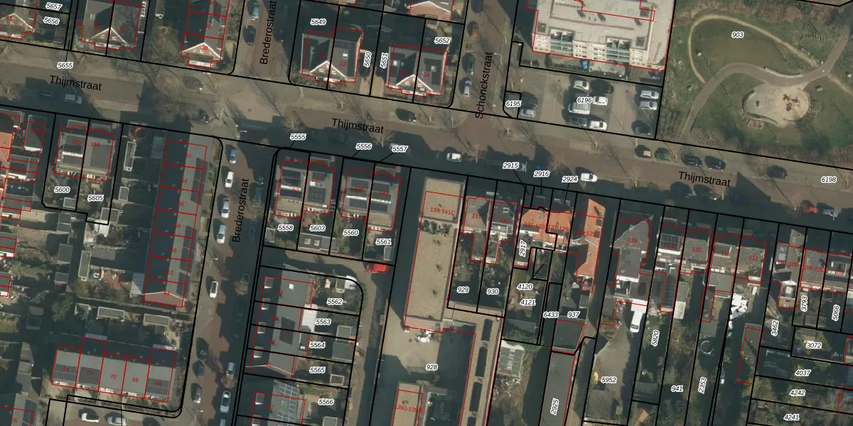 Het perceel waarop Thijmstraat 141-B staat heeft een oppervlakte van 2168 m². Dit is een zeer groot perceel. De perceeloppervlakte wordt geregistreerd door het Kadaster. Gedetailleerde informatie over de maten van dit perceel kunt u vinden in het rapport Kadastrale kaart met maatvoering van Thijmstraat 141-B.