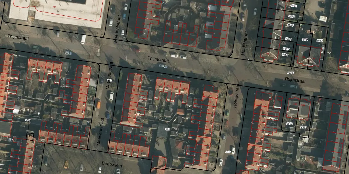 Het perceel waarop Thijmstraat 161 staat heeft een oppervlakte van 3210 m². Dit is een zeer groot perceel. De perceeloppervlakte wordt geregistreerd door het Kadaster. Gedetailleerde informatie over de maten van dit perceel kunt u vinden in het rapport Kadastrale kaart met maatvoering van Thijmstraat 161.