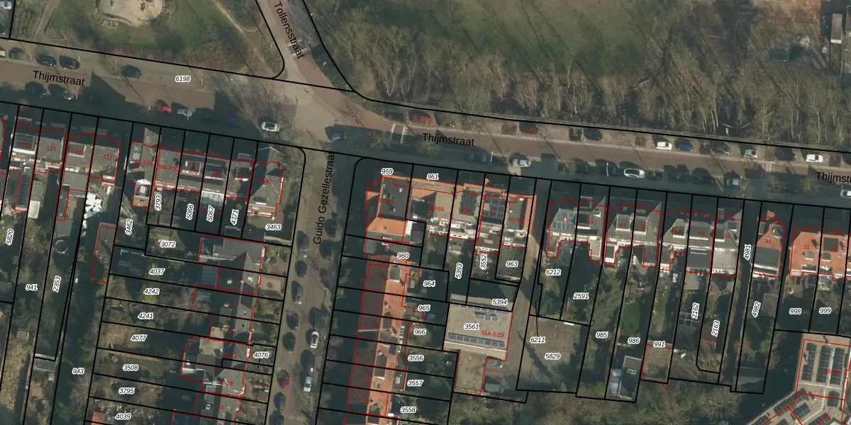 Het perceel waarop Thijmstraat 65 staat heeft een oppervlakte van 197 m². Dit is een middelgroot perceel. De perceeloppervlakte wordt geregistreerd door het Kadaster. Gedetailleerde informatie over de maten van dit perceel kunt u vinden in het rapport Kadastrale kaart met maatvoering van Thijmstraat 65.