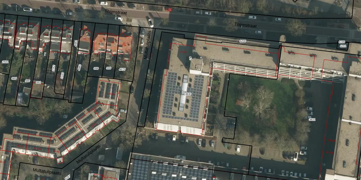 Het perceel waarop Thijmstraat 9-M staat heeft een oppervlakte van 3910 m². Dit is een zeer groot perceel. De perceeloppervlakte wordt geregistreerd door het Kadaster. Gedetailleerde informatie over de maten van dit perceel kunt u vinden in het rapport Kadastrale kaart met maatvoering van Thijmstraat 9-M.