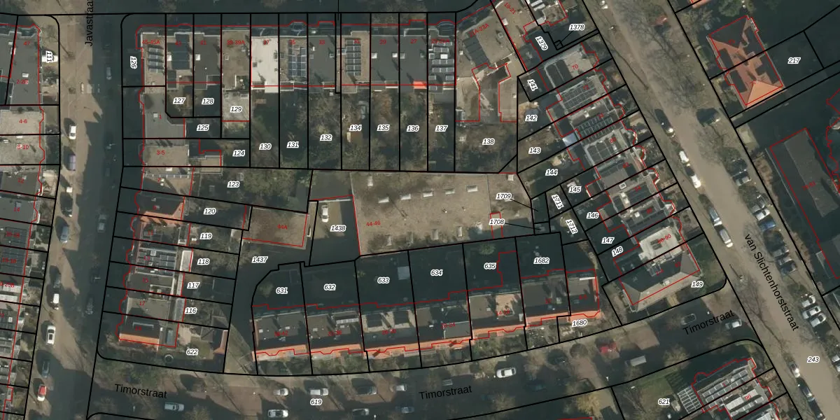 Het perceel waarop Timorstraat 44 staat heeft een oppervlakte van 948 m². Dit is een groot perceel. De perceeloppervlakte wordt geregistreerd door het Kadaster. Gedetailleerde informatie over de maten van dit perceel kunt u vinden in het rapport Kadastrale kaart met maatvoering van Timorstraat 44.