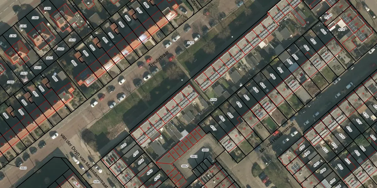 Het perceel waarop Treubstraat 25 staat heeft een oppervlakte van 3153 m². Dit is een zeer groot perceel. De perceeloppervlakte wordt geregistreerd door het Kadaster. Gedetailleerde informatie over de maten van dit perceel kunt u vinden in het rapport Kadastrale kaart met maatvoering van Treubstraat 25.