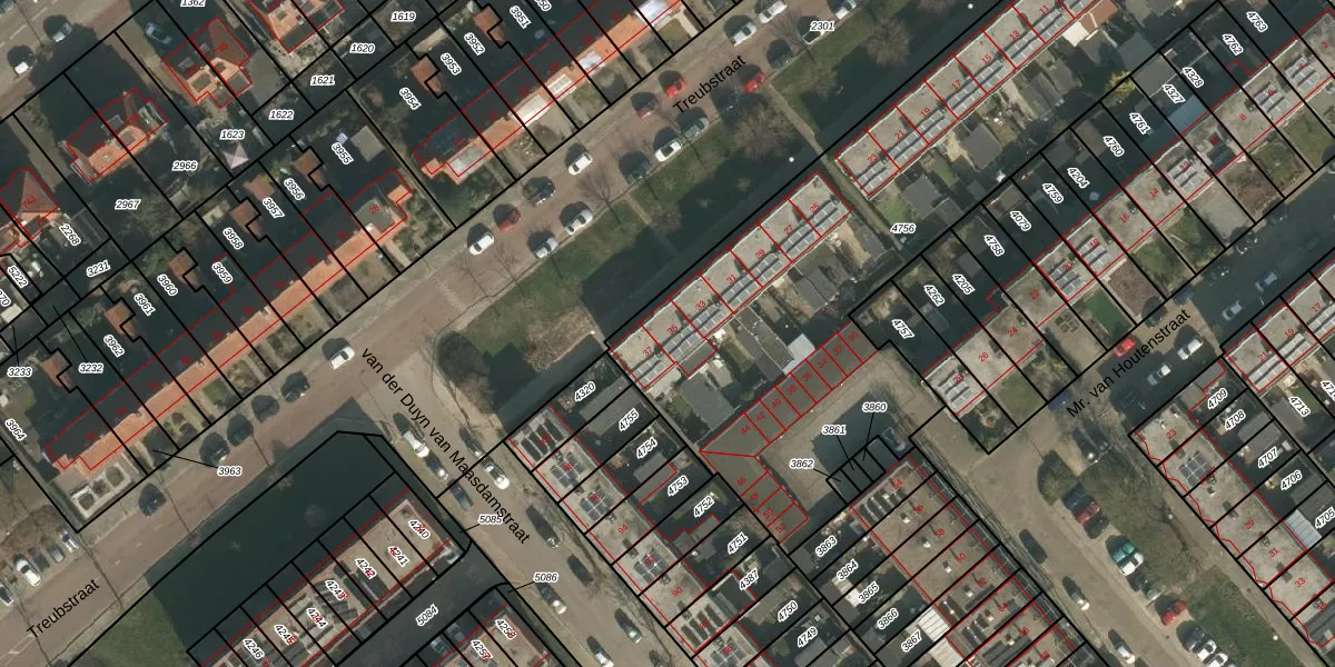 Het perceel waarop Treubstraat 35 staat heeft een oppervlakte van 3153 m². Dit is een zeer groot perceel. De perceeloppervlakte wordt geregistreerd door het Kadaster. Gedetailleerde informatie over de maten van dit perceel kunt u vinden in het rapport Kadastrale kaart met maatvoering van Treubstraat 35.