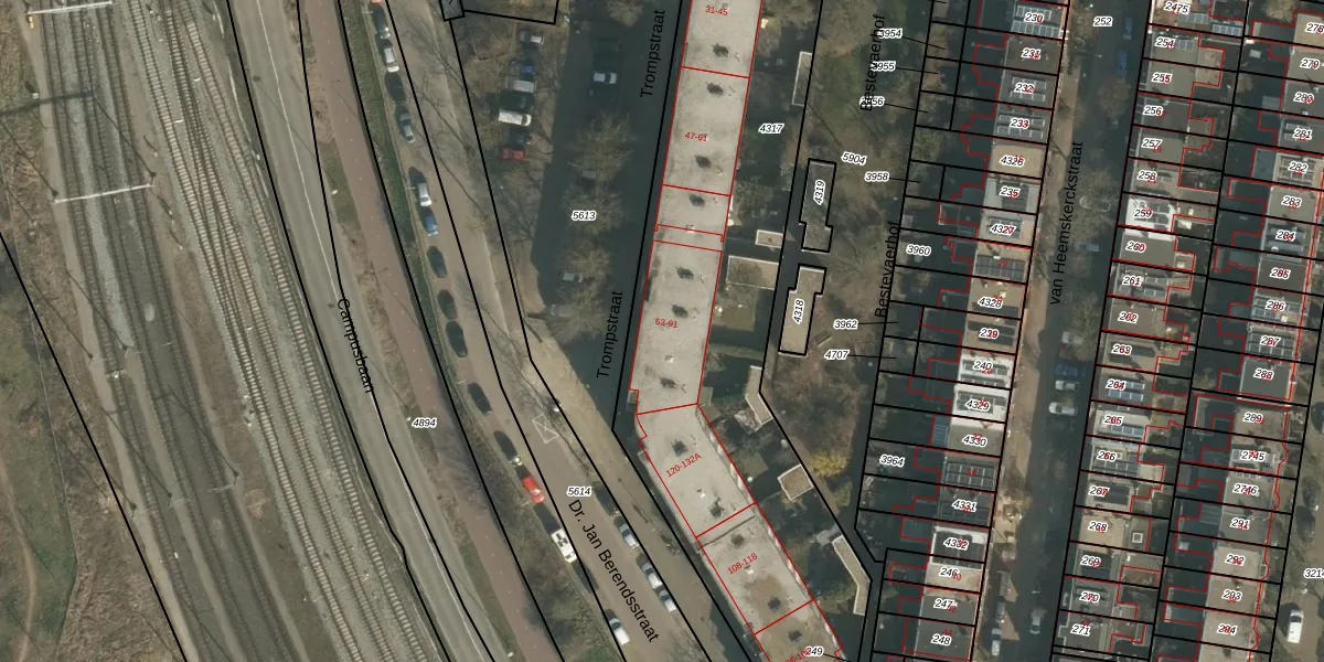 Het perceel waarop Trompstraat 85 staat heeft een oppervlakte van 3200 m². Dit is een zeer groot perceel. De perceeloppervlakte wordt geregistreerd door het Kadaster. Gedetailleerde informatie over de maten van dit perceel kunt u vinden in het rapport Kadastrale kaart met maatvoering van Trompstraat 85.