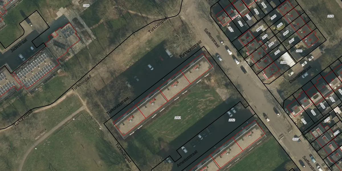 Het perceel waarop Turkooisstraat 21 staat heeft een oppervlakte van 2955 m². Dit is een zeer groot perceel. De perceeloppervlakte wordt geregistreerd door het Kadaster. Gedetailleerde informatie over de maten van dit perceel kunt u vinden in het rapport Kadastrale kaart met maatvoering van Turkooisstraat 21.