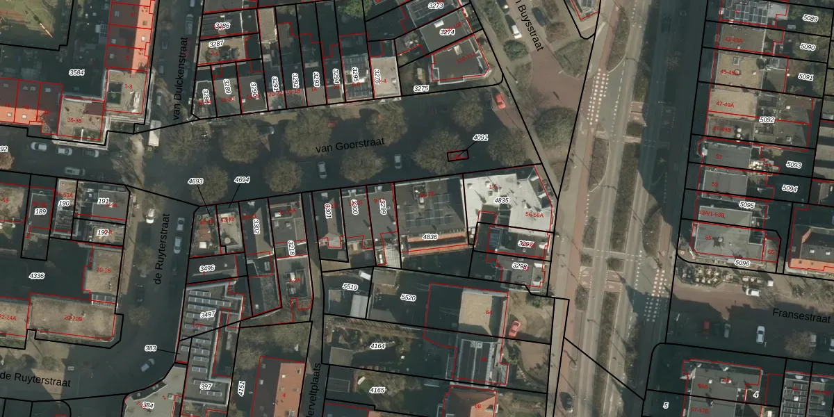 Het perceel waarop van Goorstraat 7-E staat heeft een oppervlakte van 388 m². Dit is een groot perceel. De perceeloppervlakte wordt geregistreerd door het Kadaster. Gedetailleerde informatie over de maten van dit perceel kunt u vinden in het rapport Kadastrale kaart met maatvoering van van Goorstraat 7-E.