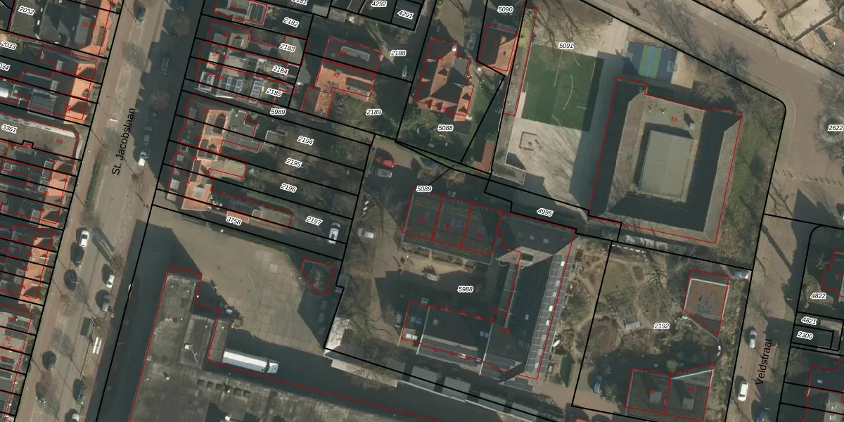 Het perceel waarop Veldstraat 4-D staat heeft een oppervlakte van 3184 m². Dit is een zeer groot perceel. De perceeloppervlakte wordt geregistreerd door het Kadaster. Gedetailleerde informatie over de maten van dit perceel kunt u vinden in het rapport Kadastrale kaart met maatvoering van Veldstraat 4-D.
