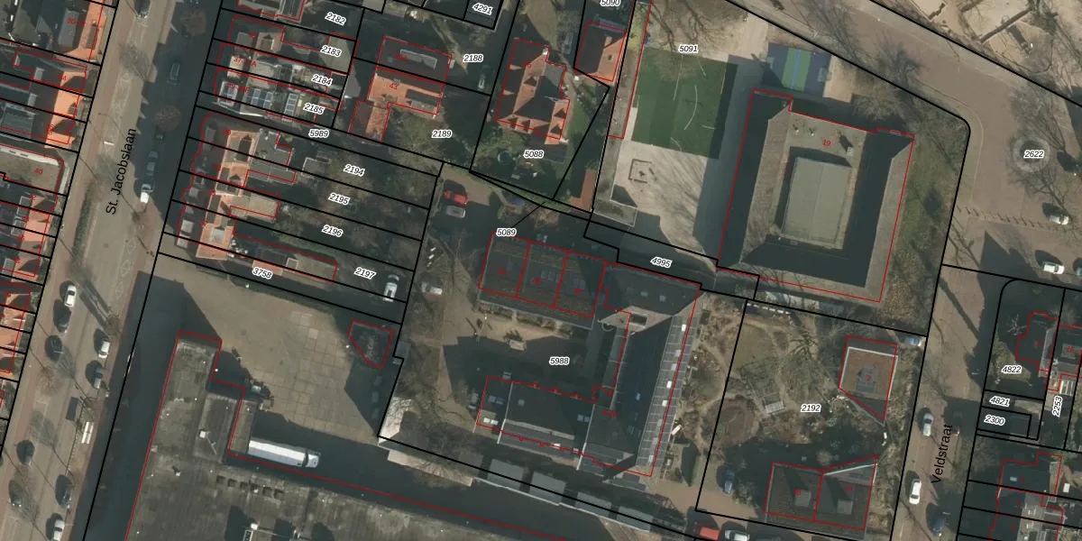 Het perceel waarop Veldstraat 4-E staat heeft een oppervlakte van 3184 m². Dit is een zeer groot perceel. De perceeloppervlakte wordt geregistreerd door het Kadaster. Gedetailleerde informatie over de maten van dit perceel kunt u vinden in het rapport Kadastrale kaart met maatvoering van Veldstraat 4-E.