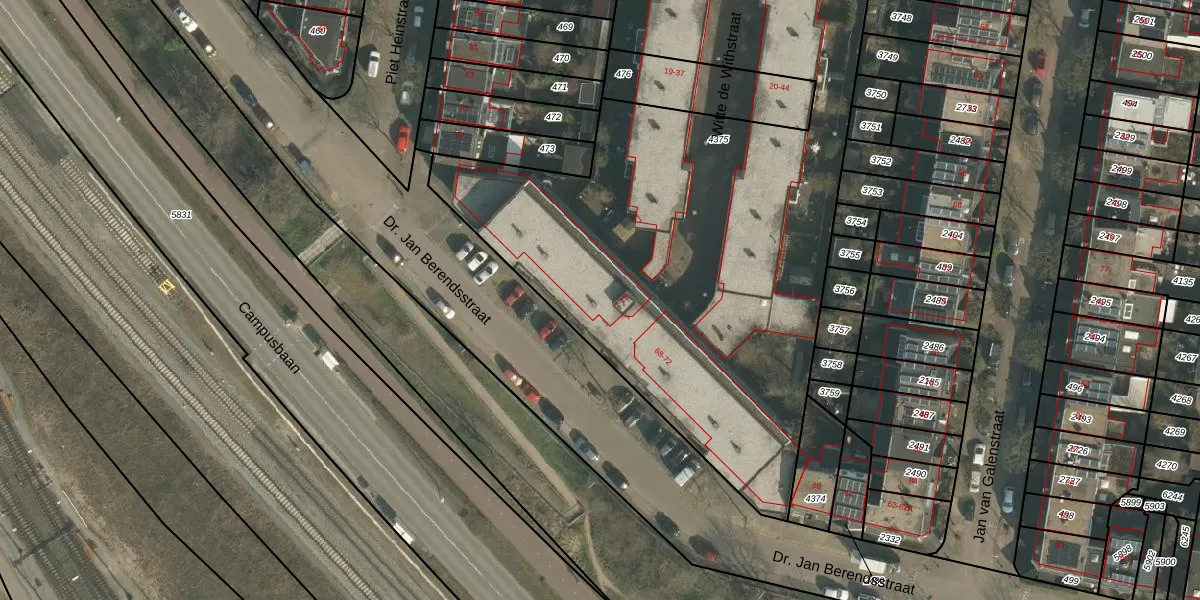 Het perceel waarop Witte de Withstraat 2 staat heeft een oppervlakte van 4476 m². Dit is een zeer groot perceel. De perceeloppervlakte wordt geregistreerd door het Kadaster. Gedetailleerde informatie over de maten van dit perceel kunt u vinden in het rapport Kadastrale kaart met maatvoering van Witte de Withstraat 2.